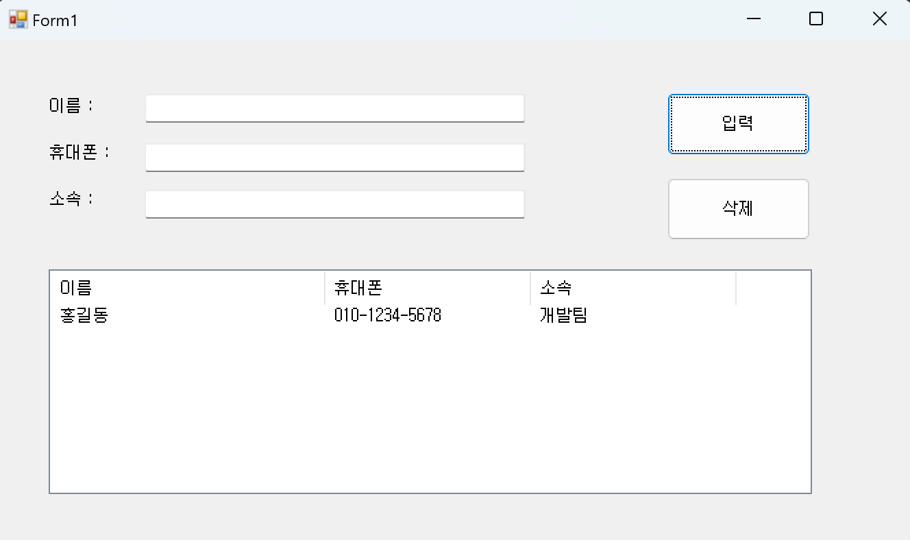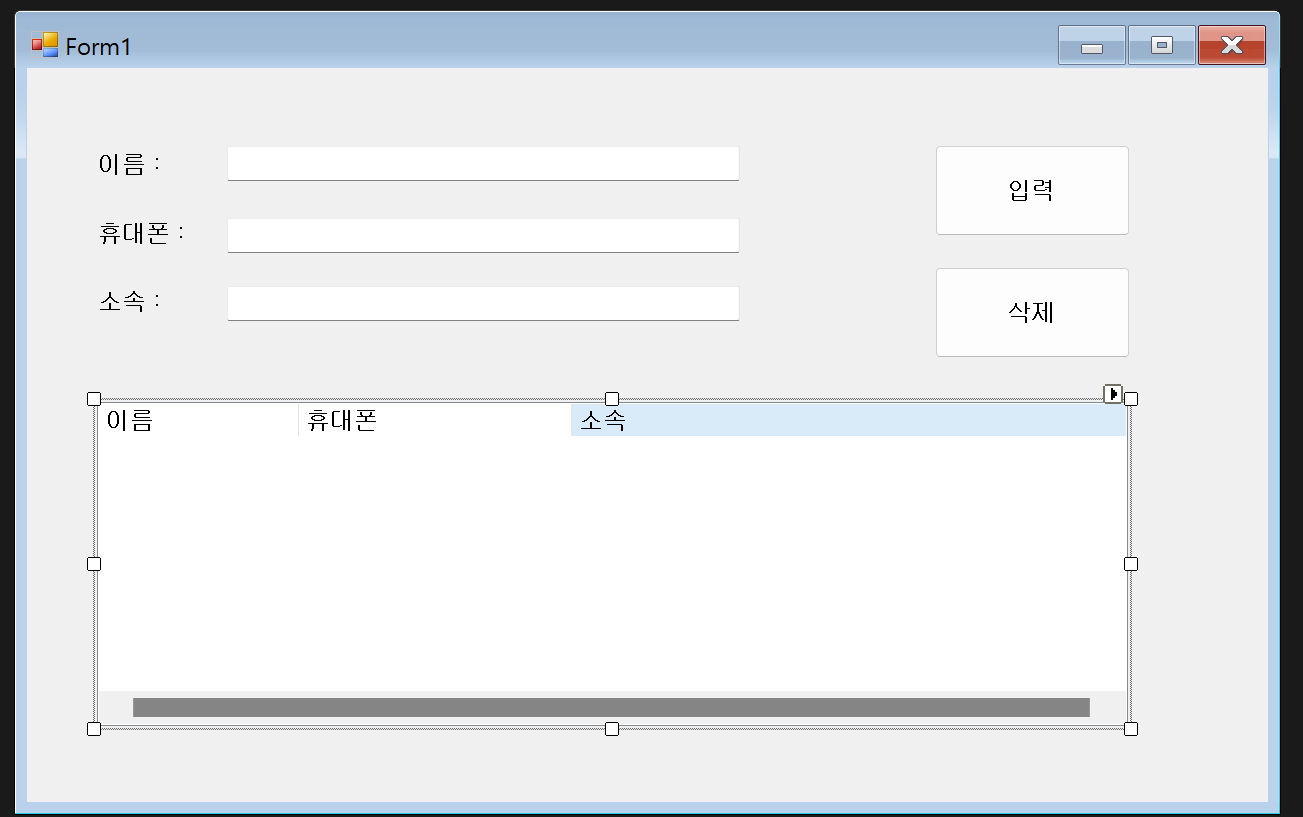 레이블 3개 , 텍스트박스 3개 , 버튼 2개 (입력,삭제), 리스트 뷰1개(ColumnHeader 속성-> 이름,휴대폰,소속 width 200,150,150 설정)