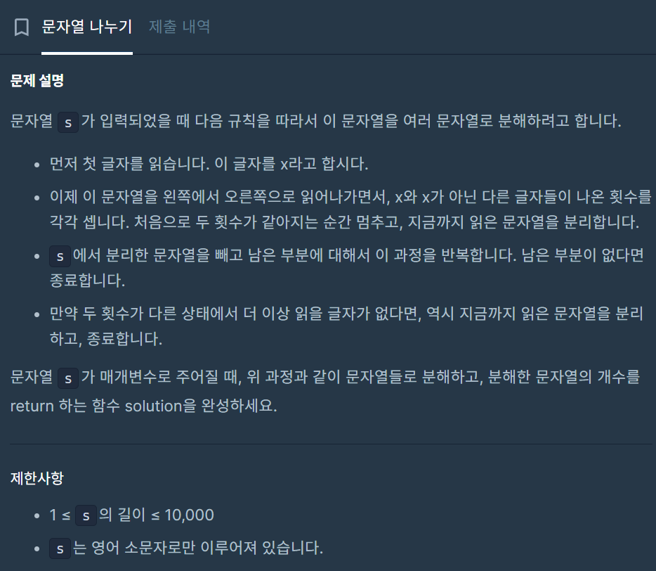 3. for char in s : 를 쓰고 s의 첫번째 문자였던 x와 같으면 x_count 증가 시키고 x와 다르면 other_count 증가시고!