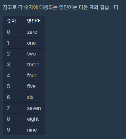 우선, 나는 각 숫자에 대한 영어로된 문자열을 리스트에 저장해서 for문을 돌리면서 비교해서 찾으면 해당 문자열을 찾은 배열 위치 값 그대로 숫자로 받는 작업을 진행할려고했으나,,, 중간에 알고리즘 설계부분에서 막혀버렸다.