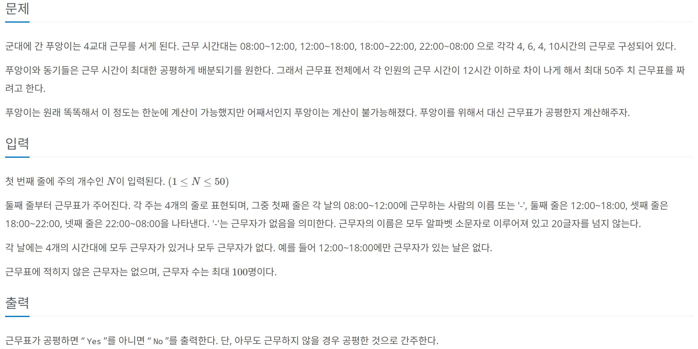 푸앙이의 근무표가 공평한지 확인하는 문제에 대해 설명하겠습니다. 주어진 근무표를 통해 각 근무자의 총 근무 시간을 계산하고, 이 시간의 차이가 12시간 이하인지 확인하면 됩니다.