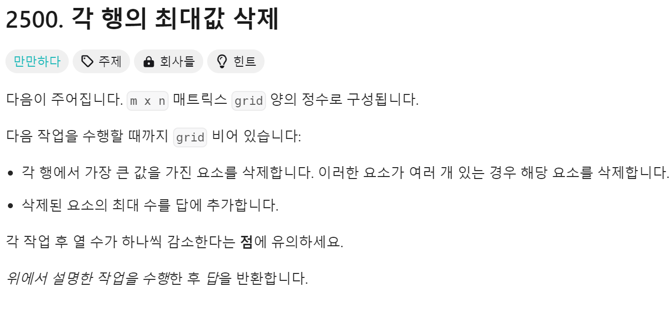 "Delete Greatest Value in Each Row"는 다차원 배열에서 각 행의 최대값을 삭제하고 그 최대값의 합을 구하는 문제입니다.