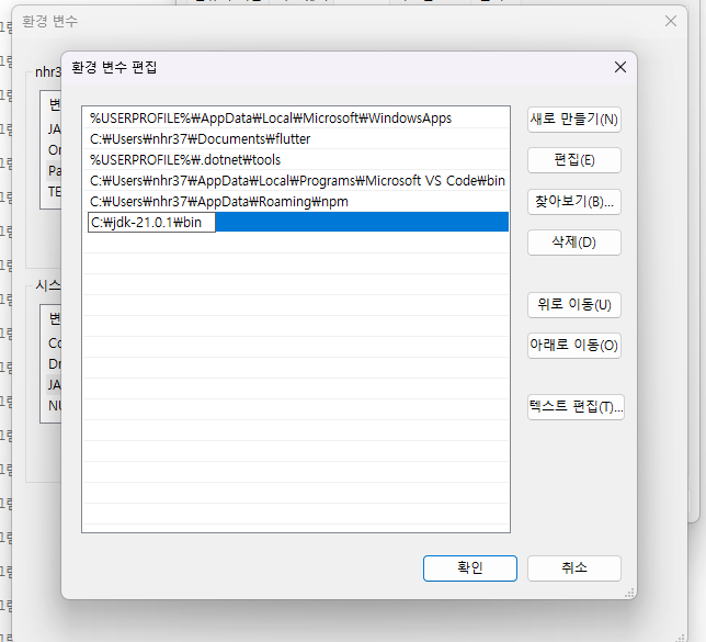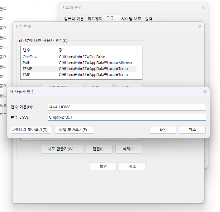 환경 변수를 새로 만들기 - 값을 JDK설치 폴더(예: C:/JSP/JDK21)로 설정해줍니다.