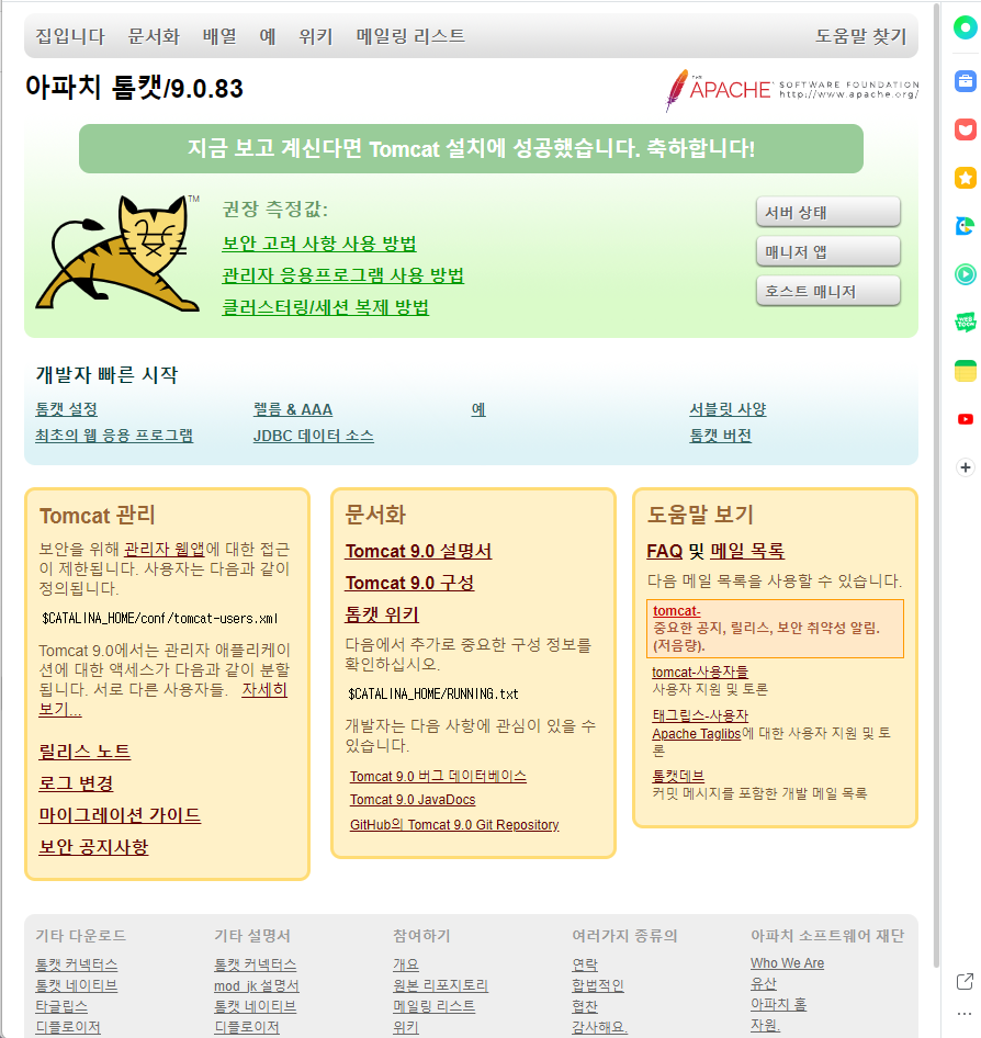 http://localhost:8080/에 접속하면 아래와 같은 화면이 뜨면서 설치성공 표시가 됩니다.